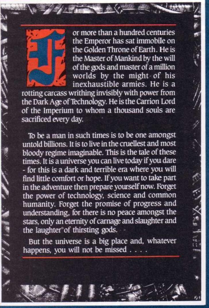 A four page, full colour insert set the premise and setting of what RT was, starting with the now famous introductory text that has graced the beginning of every 40k rule book since: